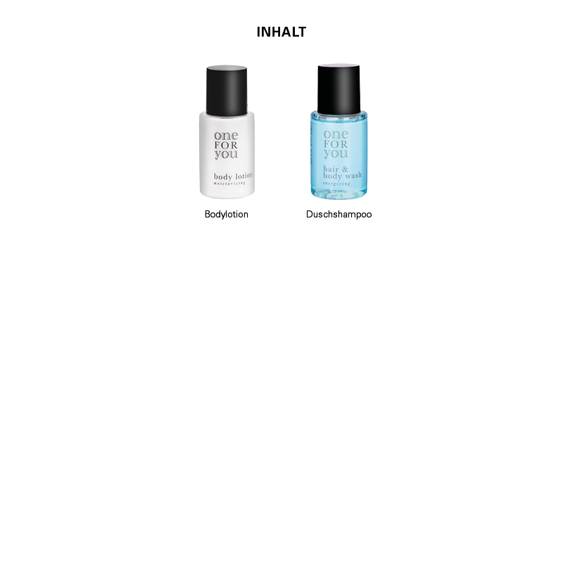 Werbebox aus weißem Karton, mir einem großen Sichtfenster, individuell beedruckt. Inhalt: 1 Set aus je 1 Bodylotion und 2-in-1-Duschshampoo mit aromatischem, blumigen, holzigem und moschusartigem Duft, 40 ml