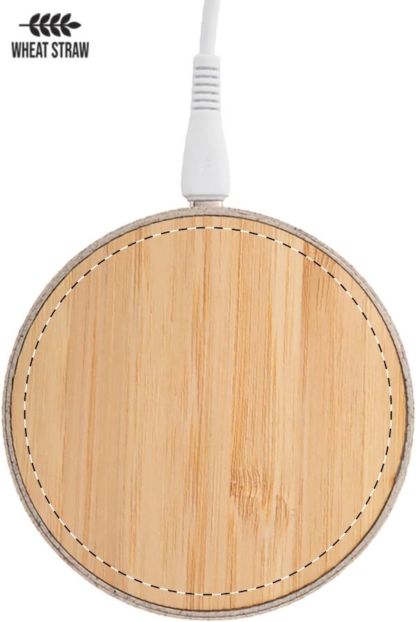 Wireless-Fastcharger (15 W) aus ökologischem Weizenstroh-Kunststoff und Bambusgehäuse. Inklusive USB-Ladekabel.