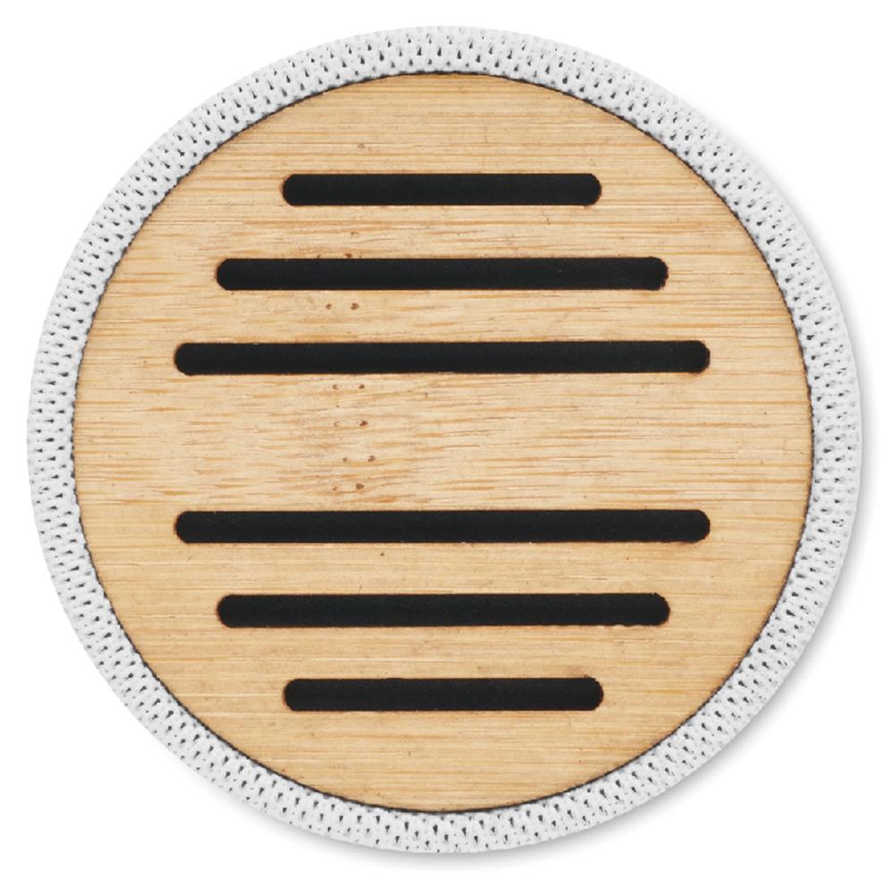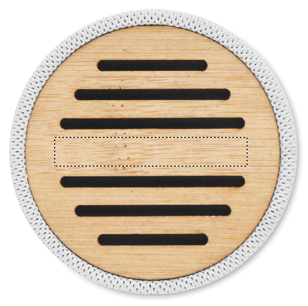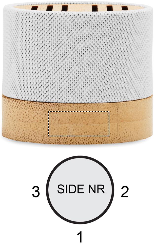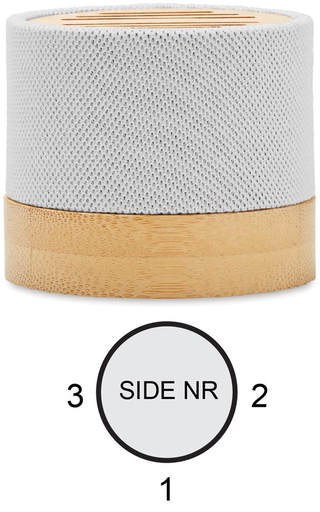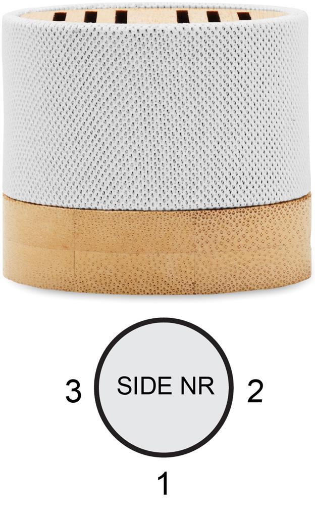 5.0 wireless Lautsprecher in RPET-Gehäuse mit Bambus. Mit LED- Lichtanzeige sowie SD-Kartenslot und AUX-/USB-Kabel. Freisprechfunktion. Inkl. 1 wiederaufladbarer Li-ION-Akku mit 300 mAh. Ausgangsdaten: 3 W, 3 Ohm und 5 V. Spielzeit ca. 3h. Bambus ist ein natürliches Produkt, es kann daher zu leichten Abweichungen in Farbe, Dekor und Maßen kommen.Material: AndereMaße: Ø6,1x5,3 cmGewicht: 0.14 kgVeredelung: Bestickung, Bedruckung, BeflockungHandling/Farbcodes: B/06, 13, 41, 03Druckposition: ROUNDSCREENDruckmaße: 130 x 25 mmDrucktechniken: RS5Druckposition: SIDE 1Druckmaße: 25 x 10 mmDrucktechniken: L2, P5Druckposition: SIDE 2Druckmaße: 25 x 10 mmDrucktechniken: L2, P5Druckposition: SIDE 3Druckmaße: 25 x 10 mmDrucktechniken: L2, P5Druckposition: TOPDruckmaße: 40 x 6 mmDrucktechniken: L2, DO1