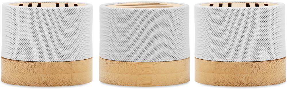 5.0 wireless Lautsprecher in RPET-Gehäuse mit Bambus. Mit LED- Lichtanzeige sowie SD-Kartenslot und AUX-/USB-Kabel. Freisprechfunktion. Inkl. 1 wiederaufladbarer Li-ION-Akku mit 300 mAh. Ausgangsdaten: 3 W, 3 Ohm und 5 V. Spielzeit ca. 3h. Bambus ist ein natürliches Produkt, es kann daher zu leichten Abweichungen in Farbe, Dekor und Maßen kommen.