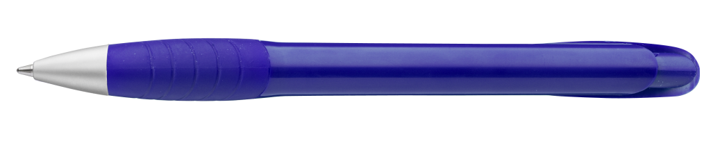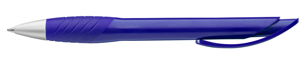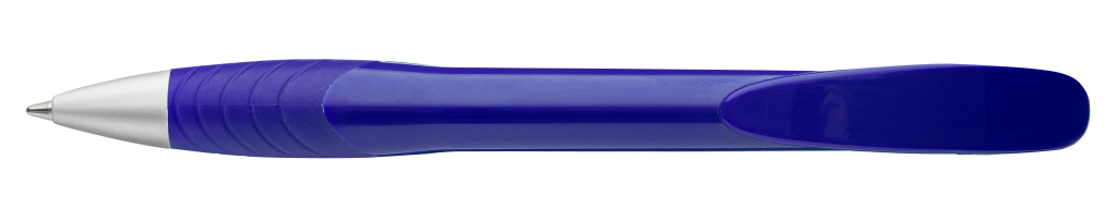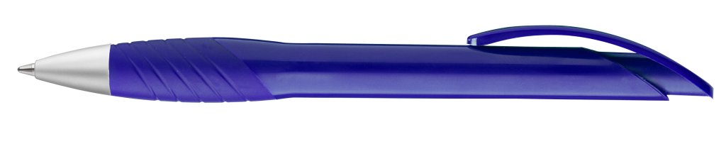 Druckkugelschreiber mit gedeckt glänzendem Gehäuse, Bogenclipdrücker, ergonomische Gummigriffzone und Metallspitze mattverchromt.