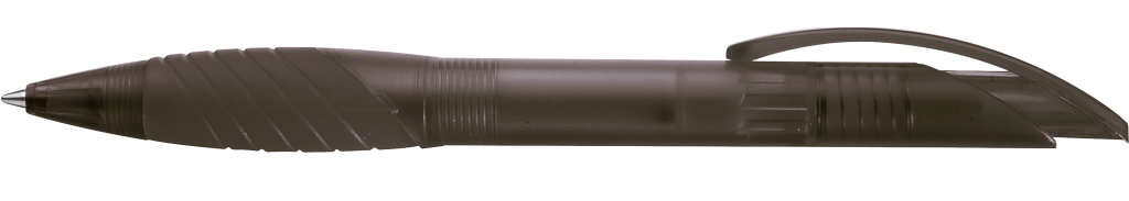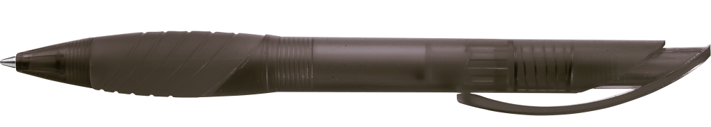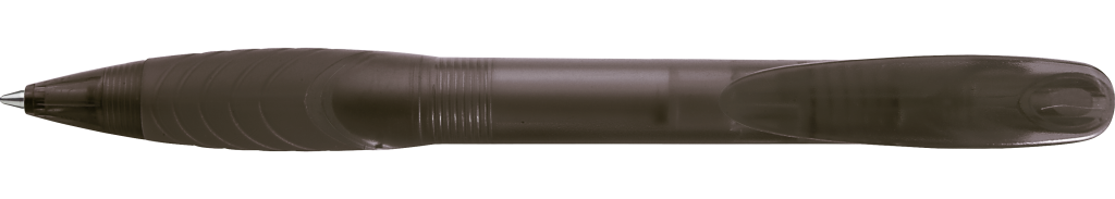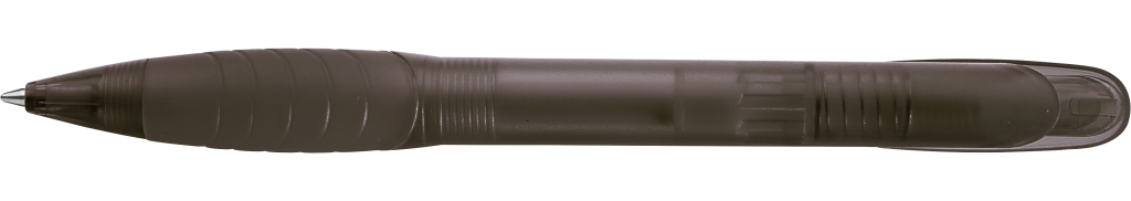 Druckkugelschreiber mit transparent gefrostetem Gehäuse, Bogenclipdrücker und Spitze, ergonomische Gummigriffzone.