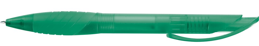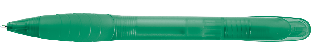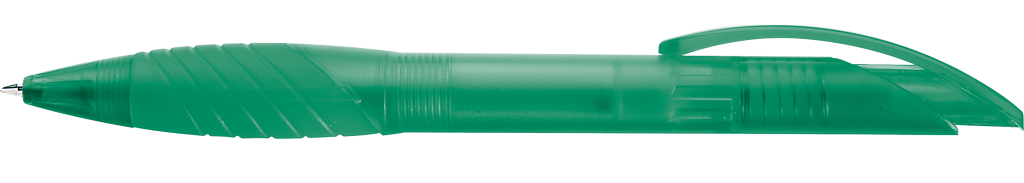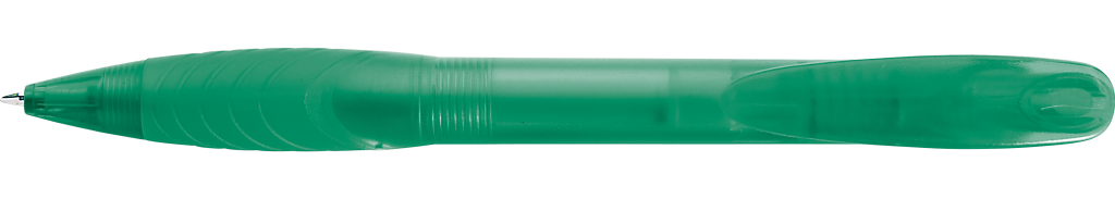 Druckkugelschreiber mit transparent gefrostetem Gehäuse, Bogenclipdrücker und Spitze, ergonomische Gummigriffzone.Druckbereich: Auf dem Clip 38mm x 8mm Tampondruck (T), in Clipverlängerung 20mm x 20mm Siebdruck (S), gegenüber vom Clip 50mm x 14mm Siebdruck (S), seitlich vom Clip 50mm x 14mm Siebdruck (S)