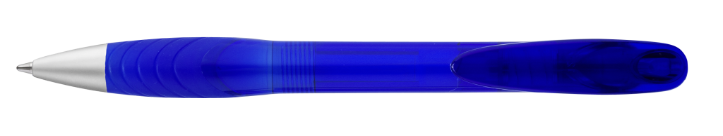 Druckkugelschreiber mit transparent glänzendem Gehäuse, Bogenclipdrücker, ergonomischer Gummigriffzone und Metallspitze mattverchromt.