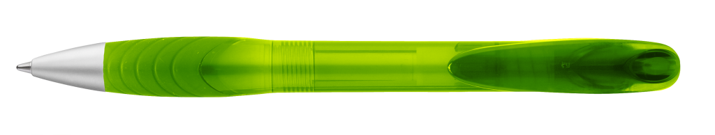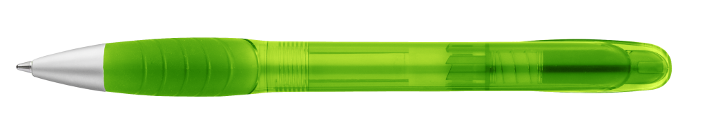 Druckkugelschreiber mit transparent glänzendem Gehäuse, Bogenclipdrücker, ergonomischer Gummigriffzone und Metallspitze mattverchromt.