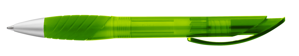 Druckkugelschreiber mit transparent glänzendem Schaft, Gummigriffzone und Clipdrücker.Druckbereich: In Clipverlängerung 35mm x 13mm Siebdruck (S), seitlich vom Clip 50mm x 13mm Siebdruck (S), gegenüber vom Clip 50mm x 13mm Siebdruck (S), auf dem Clip 40mm x 7mm Tampondruck (T)