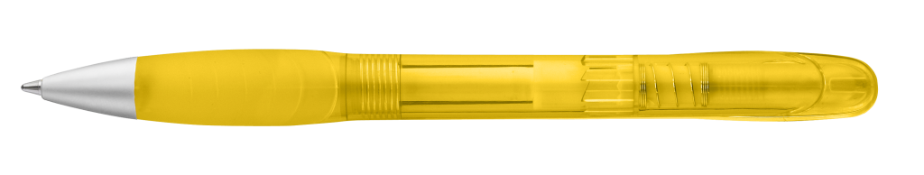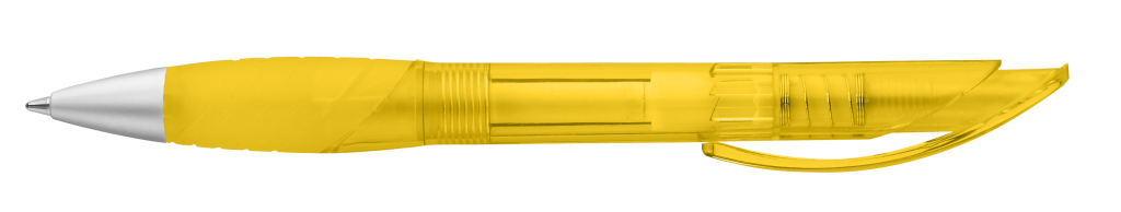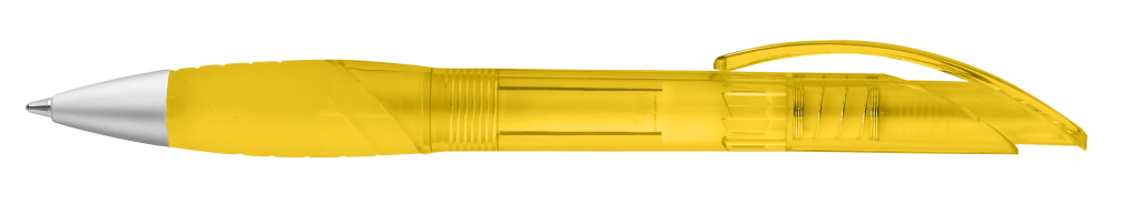 Druckkugelschreiber mit transparent glänzendem Gehäuse, Bogenclipdrücker, ergonomischer Gummigriffzone und Metallspitze mattverchromt.
