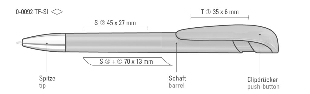 Druckbereich: In Clipverlängerung 45mm x 27mm Siebdruck (S), seitlich vom Clip 70mm x 13mm Siebdruck (S), gegenüber vom Clip 70mm x 13mm Siebdruck (S), auf dem Clip 35mm x 6mm Tampondruck (T)