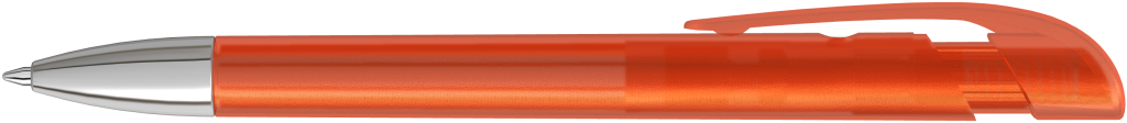 Druckkugelschreiber mit transparent gefrostetem Gehäuse, breitem Bogenclipdrücker und silberner Spitze glanzverchromt.Druckbereich: In Clipverlängerung 45mm x 27mm Siebdruck (S), seitlich vom Clip 70mm x 13mm Siebdruck (S), gegenüber vom Clip 70mm x 13mm Siebdruck (S), auf dem Clip 35mm x 6mm Tampondruck (T)